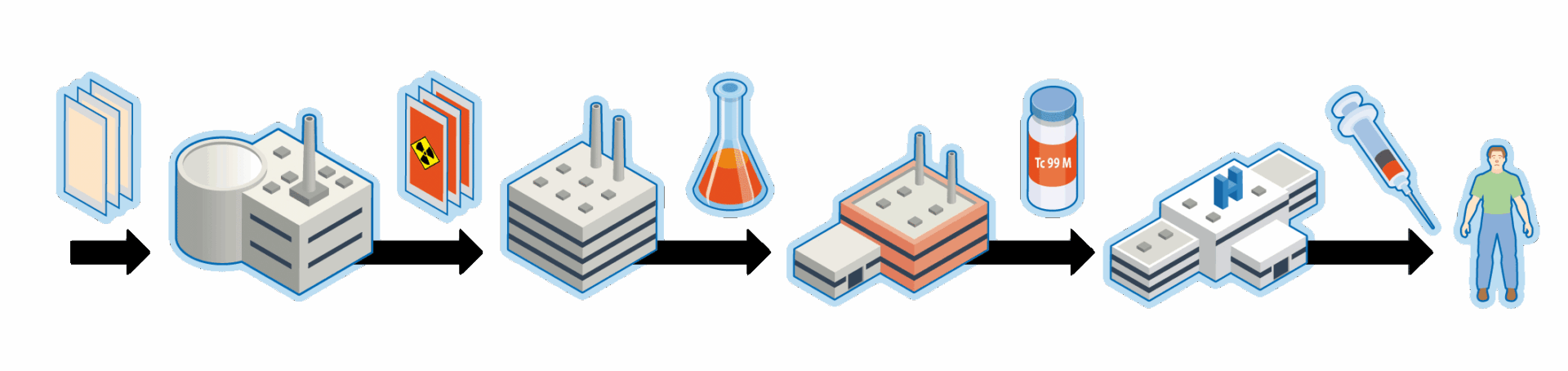 Le technétium 99m est le produit le plus utilisé en imagerie médicale. Associé à différentes molécules, il permet l’exploration d’un nombre important d’organes (thyroïde, os, cœur, reins, poumons…).
