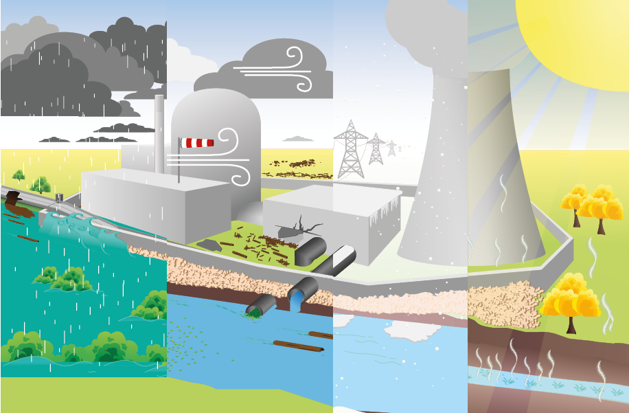 Les phénomènes naturels peuvent dégrader les matériels importants pour la sûreté des centrales ou les bâtiments qui protègent ces matériels. Par exemple, une inondation peut entraîner une entrée d’eau dans les locaux de la centrale susceptible de provoquer la défaillance des matériels situés dans ces locaux. Elle peut aussi rendre difficile l’accès au site et dégrader les alimentations électriques externes de la centrale. Ou encore, lors de vents extrêmes, des projectiles peuvent endommager les structures et bâtimentsou les matériels situés à l’extérieur.