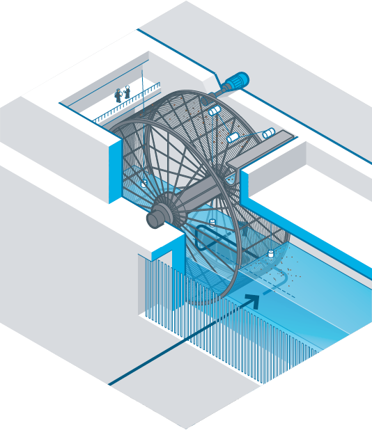 Des tambours filtrants sont installés en amont des circuits de refroidissement des centrales, ils permettent de filtrer les éléments qui pourraient colmater les prises d’eau.