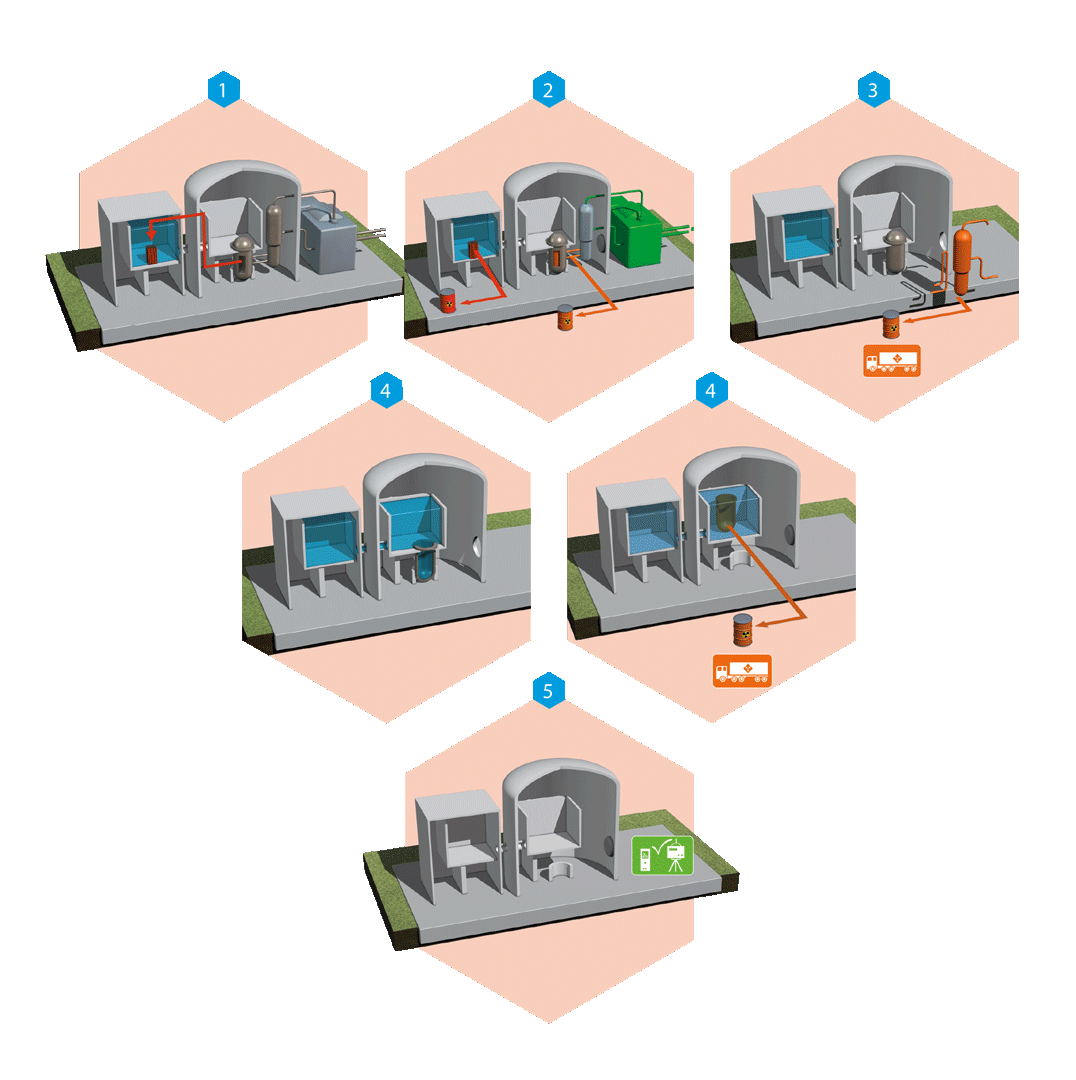 Le combustible est envoyé à l’usine de La Hague pour traitement. L’eau du circuit primaire est vidangée. Le circuit de vapeur d’eau et la turbine sont démontés.